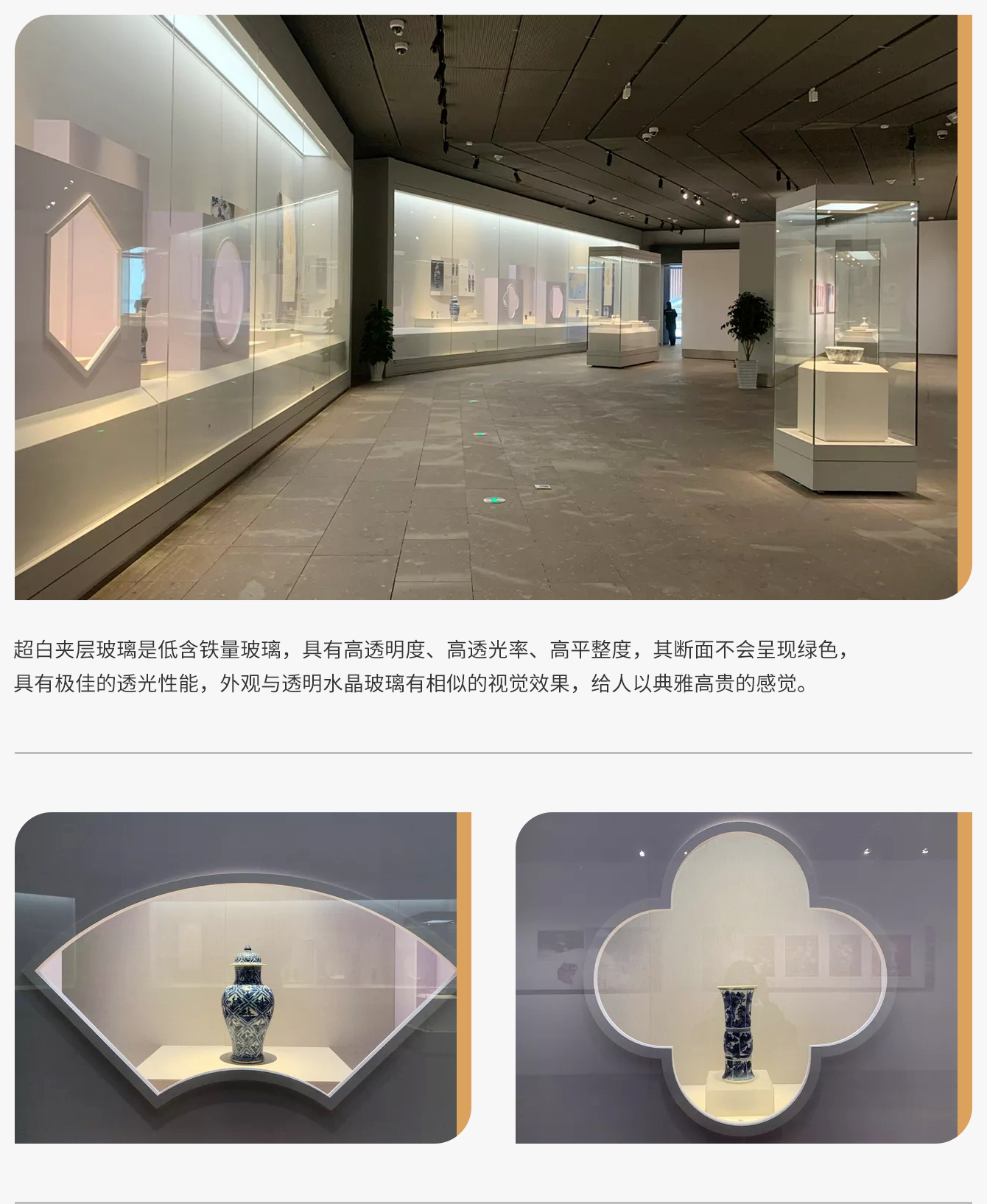 超白玻璃有效解决了偏色的问题,其水晶般光泽、清晰的亮度,在透光率上面会比普通玻璃要强的很多,从而能够使得博物馆展柜中的文物受到紫外线的作用较小,限制博物馆展柜中文物、紫外线与氧发生的光氧化反应,对博物馆展柜中的文物起到更深层次的保护作用。