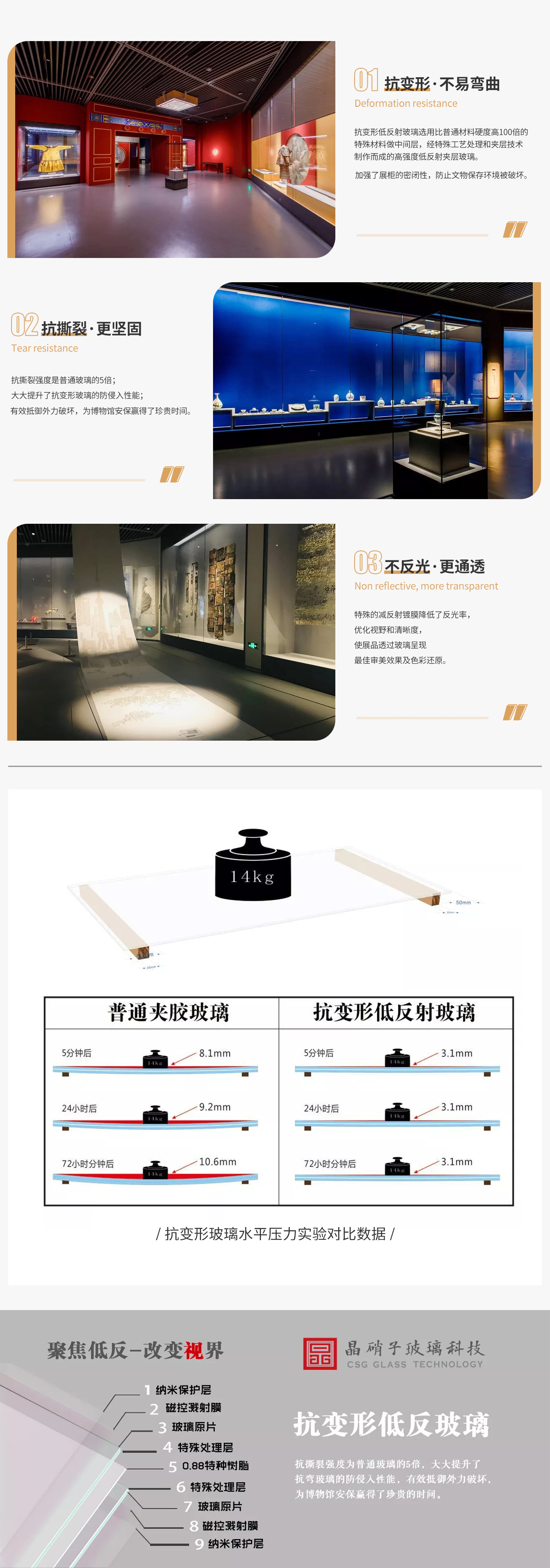 在这些严重问题的困扰下,晶硝子研发出了抗变形玻璃,解决博物馆沿墙柜弯曲变形的问题。抗变形低反玻璃选用比普通材料硬度高100倍的特殊材料做中间层,结合高品质进口原片玻璃,经过特殊工艺处理和夹层技术制作使玻璃具备抗变形性能,在防破坏及展示性方面也得到加强,更适合沿墙柜。 // 抗变形低反射玻璃-特性 //